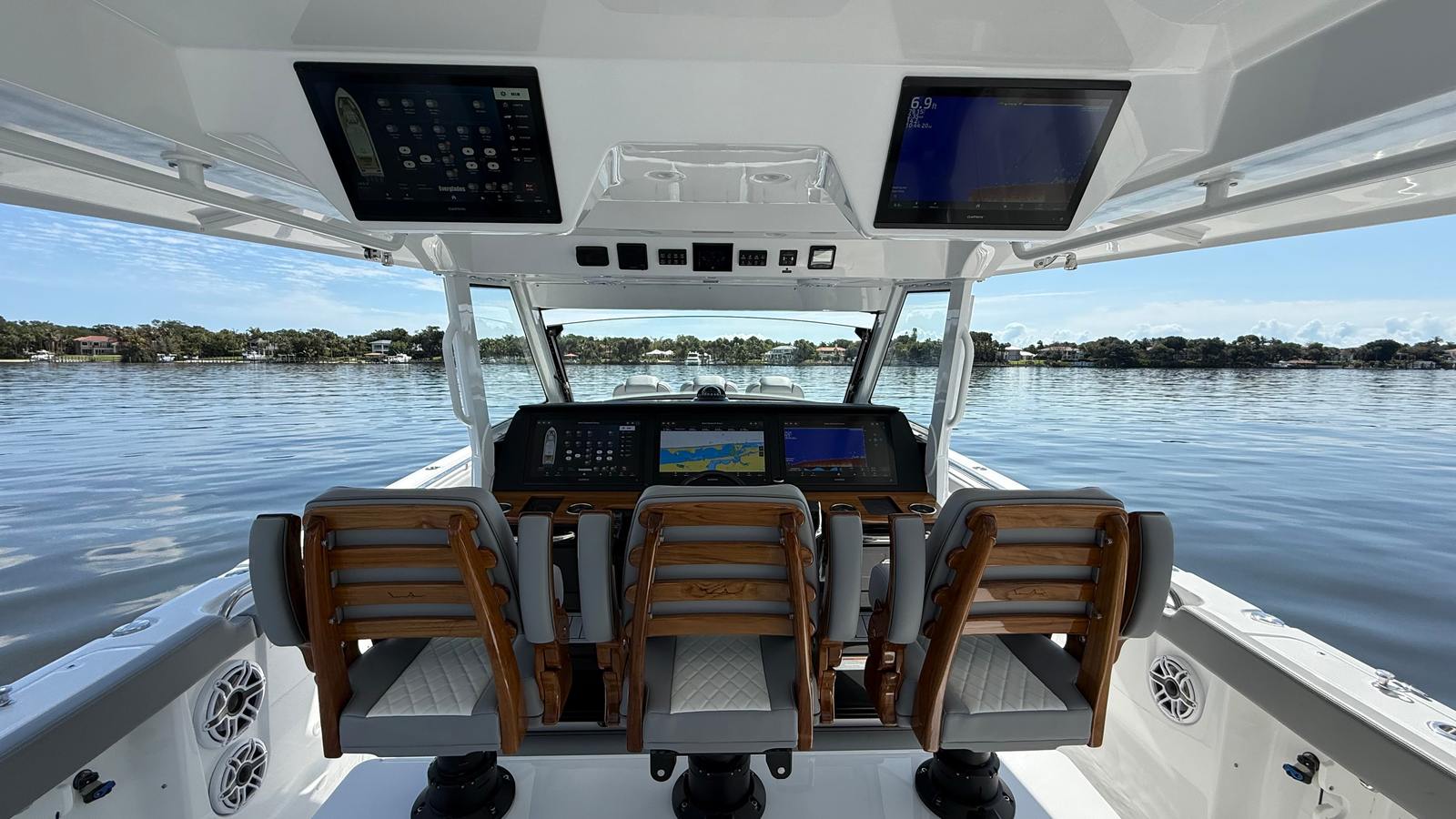 At the heart of the Everglades 455 CC is a powerhouse of performance. Equipped with four Mercury V10 Quad Engines, each delivering 425 horsepower, this center console boat boasts a total of 1,700 horsepower. The advanced Mercury engines are finished in a striking white, complementing the boat’s sophisticated appearance. The inclusion of joystick control and autopilot technology ensures that handling this vessel is both intuitive and precise, whether you are navigating tight marinas or cruising open waters. The combination of raw power and cutting-edge control systems makes the Everglades 455 CC a joy to pilot, offering exhilarating speed, smooth acceleration, and responsive maneuverability.