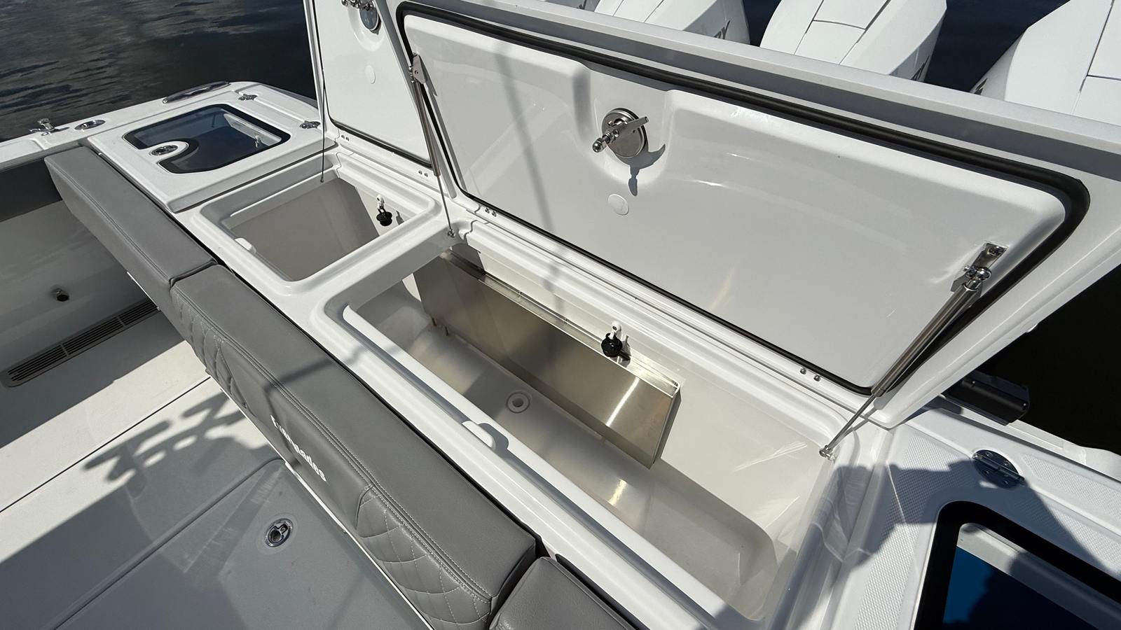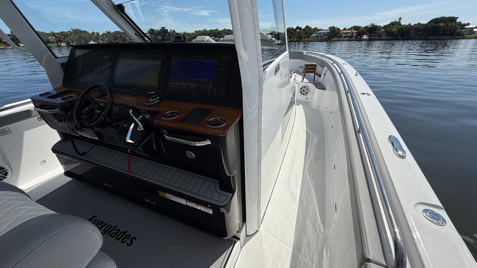 The Everglades 455 CC is as practical as it is luxurious. The joystick and autopilot features simplify docking and close-quarters maneuvering, making it easy for boaters of all experience levels to handle this impressive vessel. The spacious aft fish box provides ample storage for your catch or gear, while the internally rigged outriggers streamline your fishing setup and keep the deck organized.The durable hull and premium canvas package offer protection from sun, wind, and spray, ensuring that you and your guests stay comfortable during long days on the water. The boat’s generous length and smart design also provide plenty of storage for personal items, water toys, and safety equipment, keeping the deck clutter-free and ready for action.