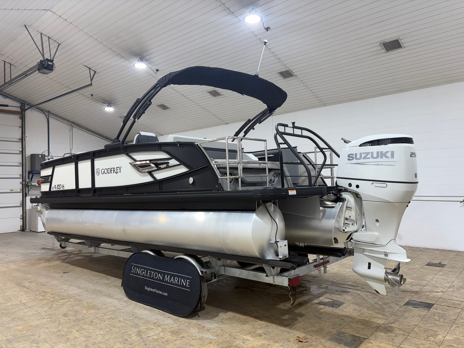 The 2024 Godfrey Aqua Patio 235 Sflc is a 23-foot pontoon boat designed to deliver exceptional comfort and style. With its spacious layout and modern amenities, this used pontoon boat offers a premium boating experience for those who appreciate quality craftsmanship and innovative design. The Godfrey Aqua Patio series is renowned for its attention to detail, and the 235 Sflc model is no exception, making it a sought-after option for anyone looking for a reliable and stylish pontoon boat for sale.