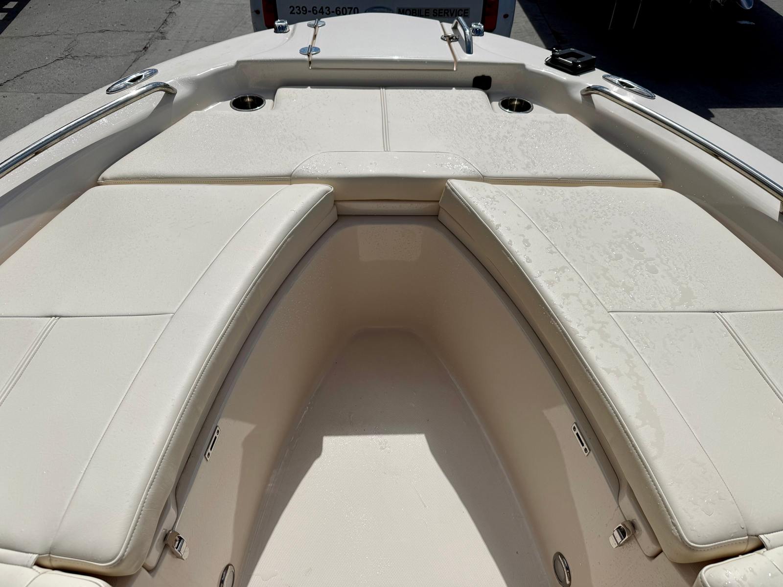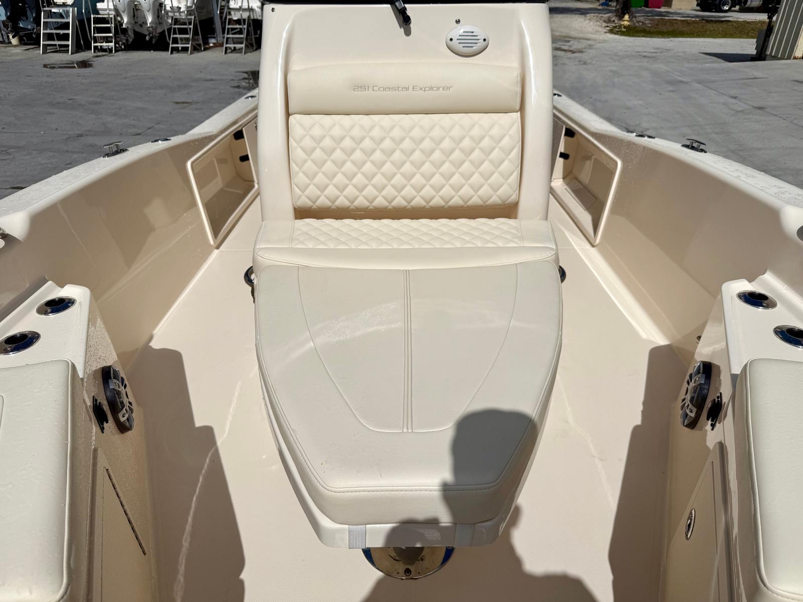 Entertainment is equally impressive with a Fusion marine audio system and speakers positioned from bow to stern, ensuring high-quality sound throughout the boat. Anglers will appreciate the thoughtfully placed rod holders, spacious livewell, and ample cockpit space, making this vessel equally suited for serious fishing or casual cruising. Freshwater and raw water washdown systems make cleanup quick and convenient after a day on the water.