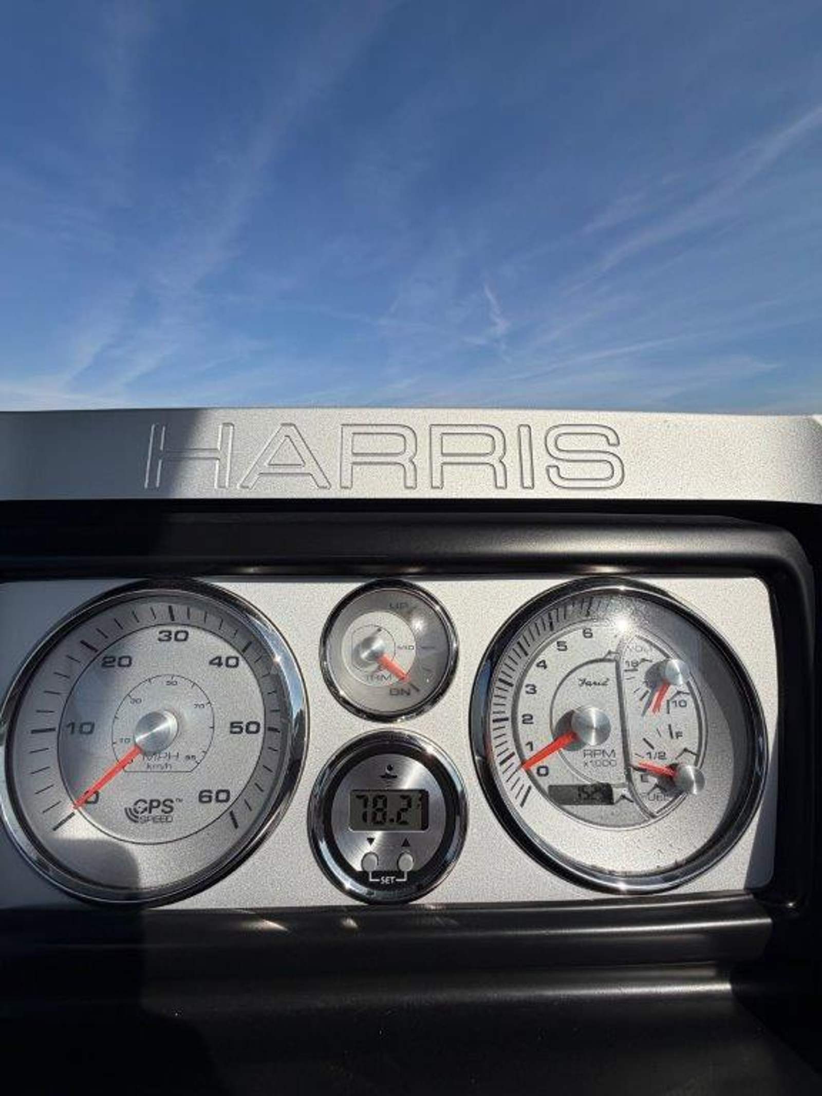 The dual-lounger layout with a center walk-through remains one of Harris’ most sought-after designs, providing plenty of space for guests to stretch out, lounge, and entertain. The helm continues the luxury feel with a stylish vinyl-wrapped, cross-stitched steering wheel, a high-back reclining helm chair, and intuitive controls.