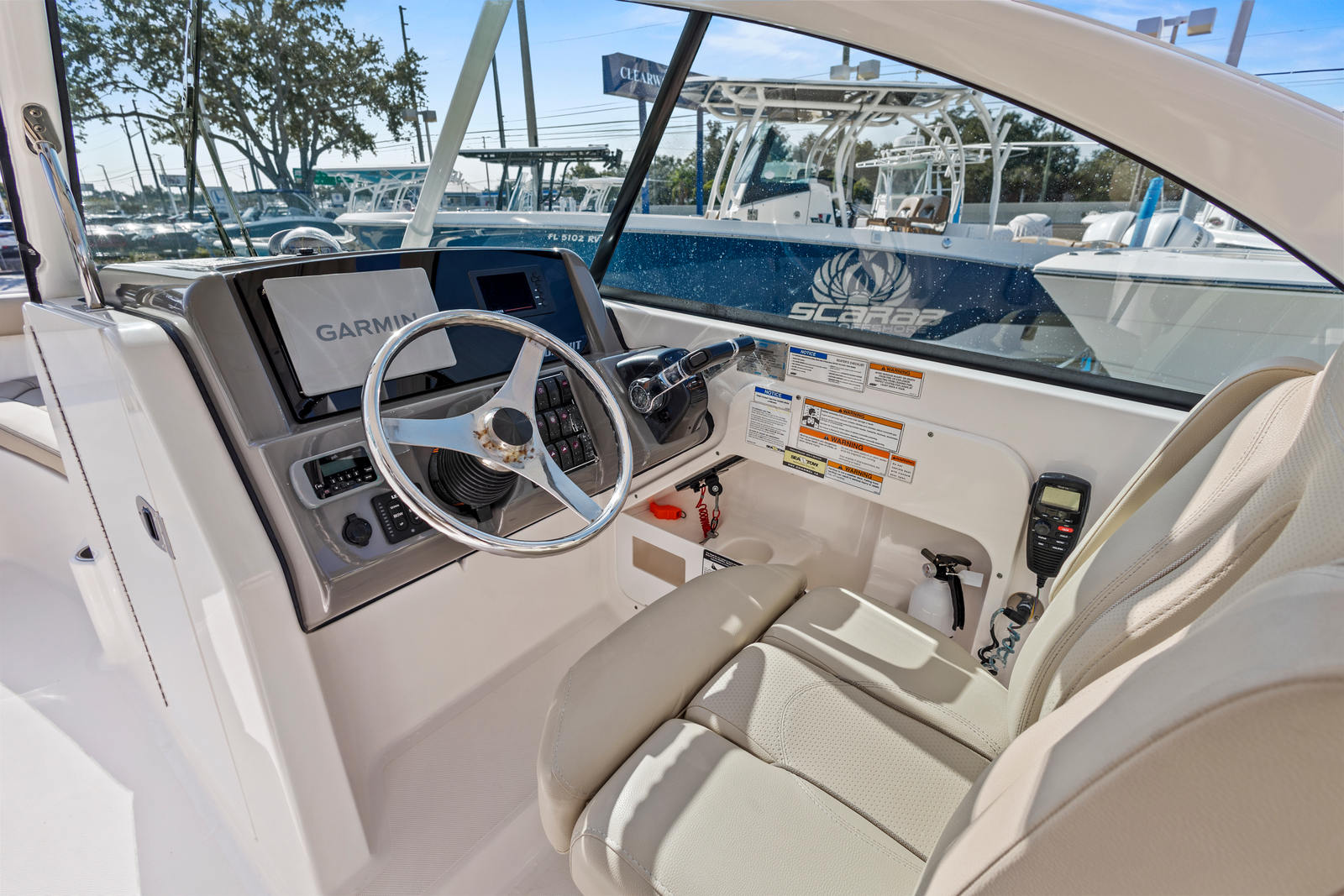 Step aboard and you’re immediately greeted by a thoughtfully designed layout that prioritizes comfort, safety, and versatility. From the expansive wraparound bow seating to the plush co-captain and helm chairs, every inch of the deck is optimized for both function and luxury. The starboard-side walkthrough windshield and hardtop offer superior protection from the elements without obstructing your view. Stainless-steel grab rails, non-skid decking, and abundant seating make this a truly family-friendly platform.