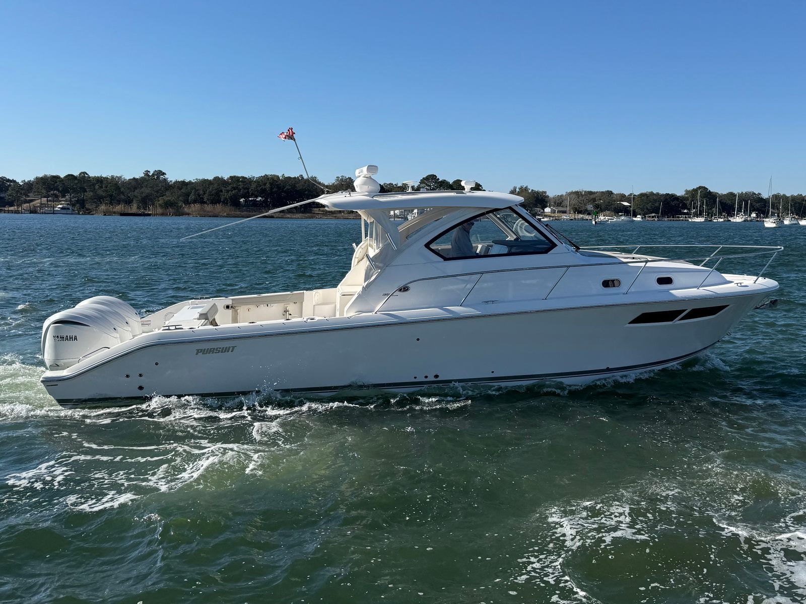 The Pursuit OS 355 Cruiser is designed with both functionality and luxury in mind. Its spacious layout allows for comfortable seating, generous deck space, and easy movement throughout the boat. The 37.92-foot length ensures that you have plenty of room for guests, gear, and activities, making it a versatile platform for everything from family outings to entertaining friends. Pursuit’s attention to detail is evident in the quality of materials, the thoughtful design of the cabin and cockpit, and the overall fit and finish of the boat.Special features of the Pursuit OS 355 include its triple-engine configuration, which not only enhances performance but also provides added reliability and safety. The engines’ combined 900 horsepower allows for swift acceleration and smooth cruising, while the low engine hours mean you can enjoy peace of mind knowing the boat is in excellent condition. The used status of this Pursuit boat for sale offers a fantastic opportunity to own a nearly new vessel at a competitive price, making it a smart investment for boating enthusiasts.