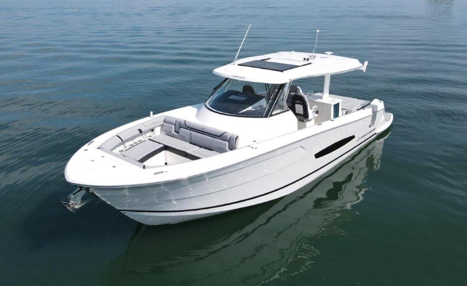 This particular 38 Surf is equipped with a wide range of upgrades designed for comfort, entertainment, and time on the water. Highlights include digital switching, cockpit and cabin A/C and heat, bow thruster, electric aft shade, cockpit TV, cockpit grill, dual cockpit refrigerators, and the Ultimate JL Audio package with satellite tuner and antenna. Additional features include the Ultimate RGBW underwater lighting package, underwater power platform with ReFLEX swim platform, windlass with rope and chain, Garmin VHF radio, cockpit Seagrass flooring, stainless steel upgrade package, bow and seat covers, toasted oak salon flooring, and mosaic countertops.