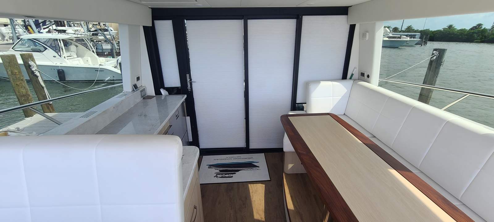 Twin Garmin 22 inch screens, VHF Radio, Radar, Auto Pilot, LED Trim Indicator, Fusion stereo system, Sat TV, Fridge freezer option, two burner stove, Washer Dryer combo, Two head stateroom configuration with one having the walk-in shower.