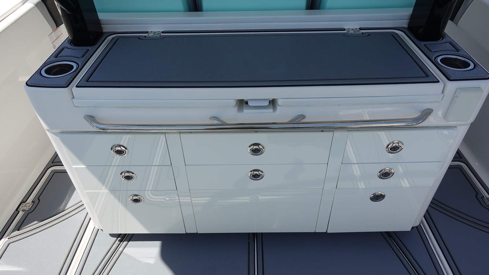 Powering the Robalo 360 CC are three high-performance engines, delivering a combined 900 horsepower. This triple-engine setup ensures thrilling acceleration, smooth cruising, and exceptional handling even in challenging conditions. Whether you’re navigating coastal waters, heading offshore for a fishing expedition, or simply enjoying a leisurely cruise, the 360 CC’s powerful engines provide the confidence and capability to tackle any adventure. The advanced engineering behind Robalo’s hull design further enhances stability and efficiency, allowing for a comfortable ride and impressive fuel economy.