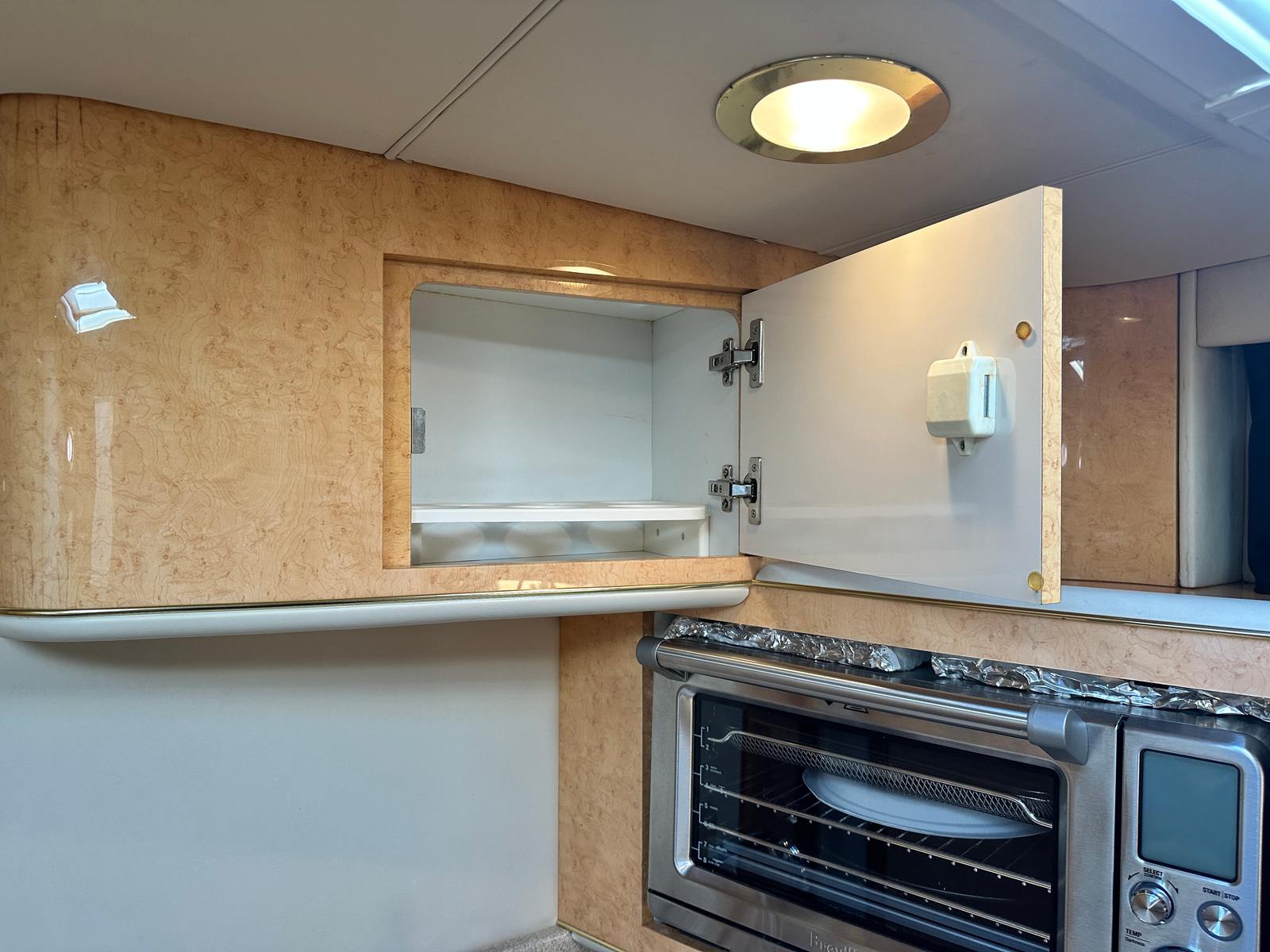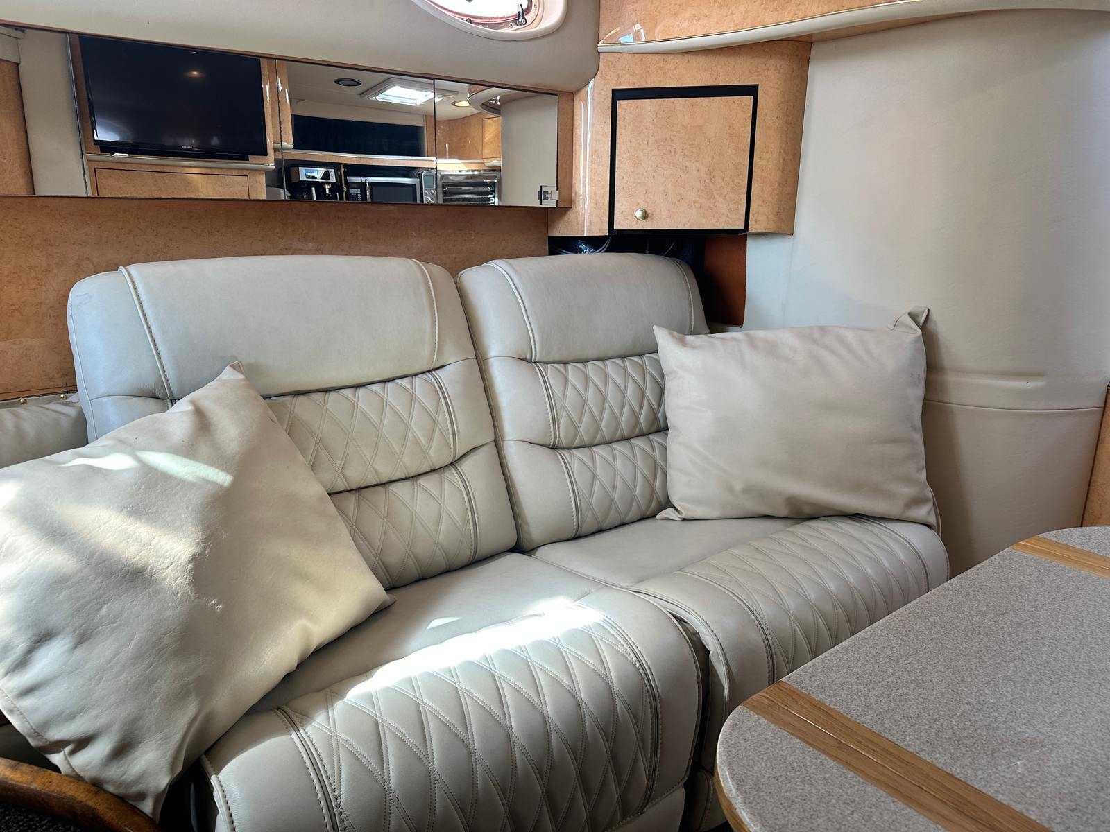 Under the hood, the Sundancer 450 is powered by twin engines, delivering a combined 840 horsepower. With only 428 engine hours, these motors promise robust performance and longevity, ensuring many more seasons of smooth cruising ahead. The dual-engine setup provides enhanced maneuverability and stability, making docking and navigating tight spaces a breeze. Whether you’re cruising along the coastline or heading out for a weekend adventure, the Sundancer 450’s powerful engines offer the speed and reliability you need for a truly exhilarating experience on the water.