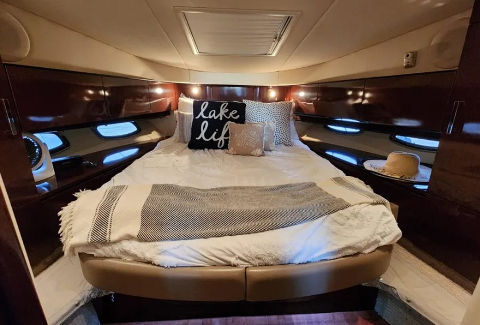 Powered by twin Cummins QSB 480 diesel engines with pod drives, this Sundancer delivers confident performance and remarkable joystick maneuverability, especially in tight spaces or while docking. Both pods have been recently serviced. The engines have approximately 800 hours, and the 15kW Onan generator has around 600 hours, with recent service completed. The boat has also been buffed and waxed on all fiberglass surfaces.
